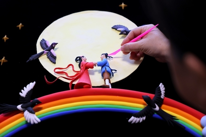 8月29日七夕節(jié),在山東省棗莊市非物質(zhì)文化遺產(chǎn)保護中心,民間藝人創(chuàng)作面塑作品《鵲橋會》。