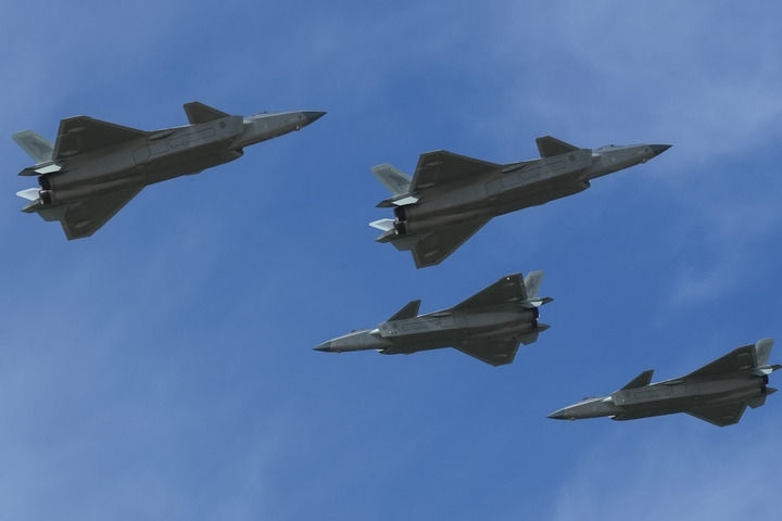 ↑9月19日,殲-20進(jìn)行四機(jī)編隊(duì)機(jī)動(dòng)飛行展示。新華社記者 許暢 攝