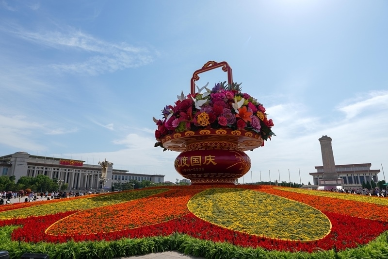 9月25日,2025年“祝福祖國”巨型花籃正式完工,亮相天安門廣場(chǎng)與市民共度佳節(jié)。今年“祝福祖國”花壇以喜慶的花籃為主景,花壇頂高18米,籃體高16米,籃盤直徑12米。籃體南側(cè)書寫“祝福祖國”“1949-2025”字樣,籃體北側(cè)書寫“歡度國慶”“1949-2025”字樣?;@內(nèi)選取了美好寓意的花卉,其中荷花寓意“和和美美”、橄欖枝寓意“榮耀和平”等,還結(jié)合和平鴿元素,體現(xiàn)“和平發(fā)展、欣欣向榮”。