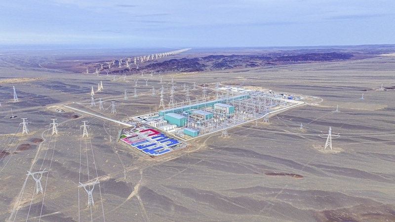 9月22日在新疆巴音郭楞蒙古自治州若羌縣拍攝的三峽集團(tuán)“疆電外送”第四通道電源項(xiàng)目施工現(xiàn)場(chǎng)(無(wú)人機(jī)照片)。