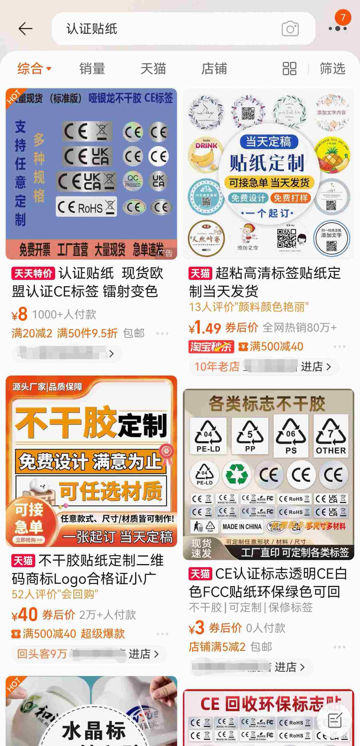 7月1日,記者在多個電商平臺發(fā)現(xiàn),雖然已無法在平臺搜索到“3C貼紙”相關(guān)商品,但仍存在大量“定制貼紙”“定制標(biāo)識”類商家。