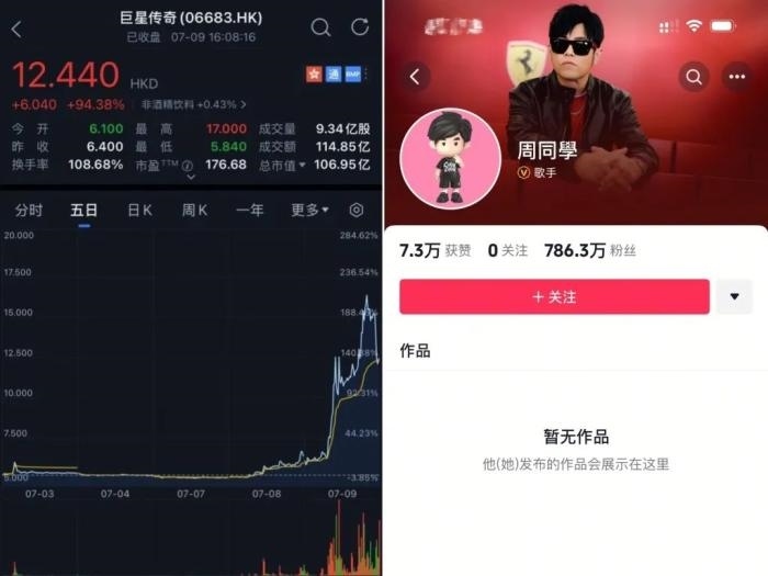 7月9日,周杰倫宣布入駐抖音平臺(tái),賬號(hào)以其官方二次元IP形象“周同學(xué)”命名,頭像也是“周同學(xué)”IP化身,認(rèn)證身份為歌手。受該消息的提振,“周杰倫概念股”巨星傳奇(6683.HK)9日收漲94.37%,收盤價(jià)為12.44港元,總市值106.95億港元,單日成交量9.34億股,成交額達(dá)114.85億港元;盤中一度拉升漲165.62%,兩個(gè)交易日暴漲146.34%。