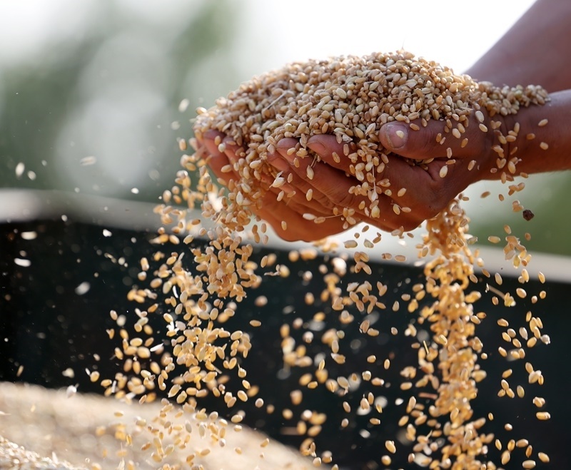 5月28日,山東省臨沂市郯城縣郯城街道農(nóng)民查看收獲的小麥。