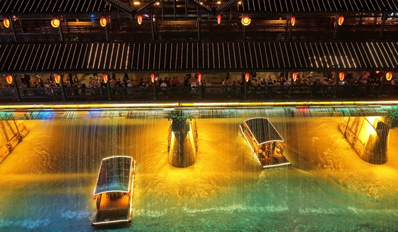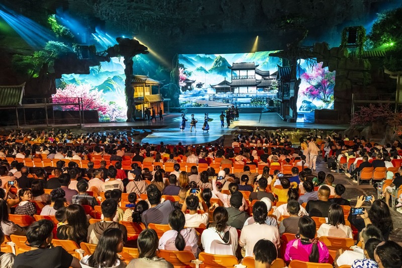 7月10日,游客在利川市騰龍洞的洞穴內(nèi)觀看實(shí)景劇《夷水麗川》。