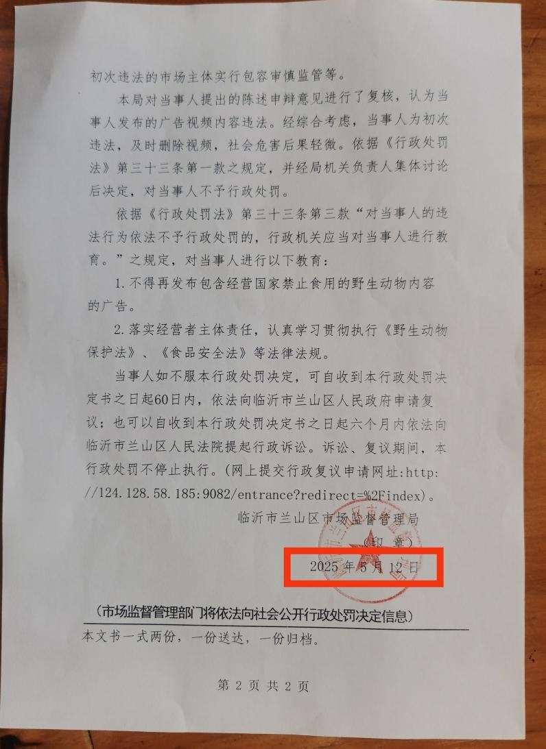 7月14日,山東臨沂“拍蛤蟆湯視頻被罰45萬元”事件迎來最新進(jìn)展。代理此案的律師龔華告訴津云新聞記者,涉事飯館收到當(dāng)?shù)厥袌霰O(jiān)管局送達(dá)的《不予行政處罰決定書》,但落款時間卻為5月12日,其認(rèn)為本次送達(dá)的程序不合規(guī)。
