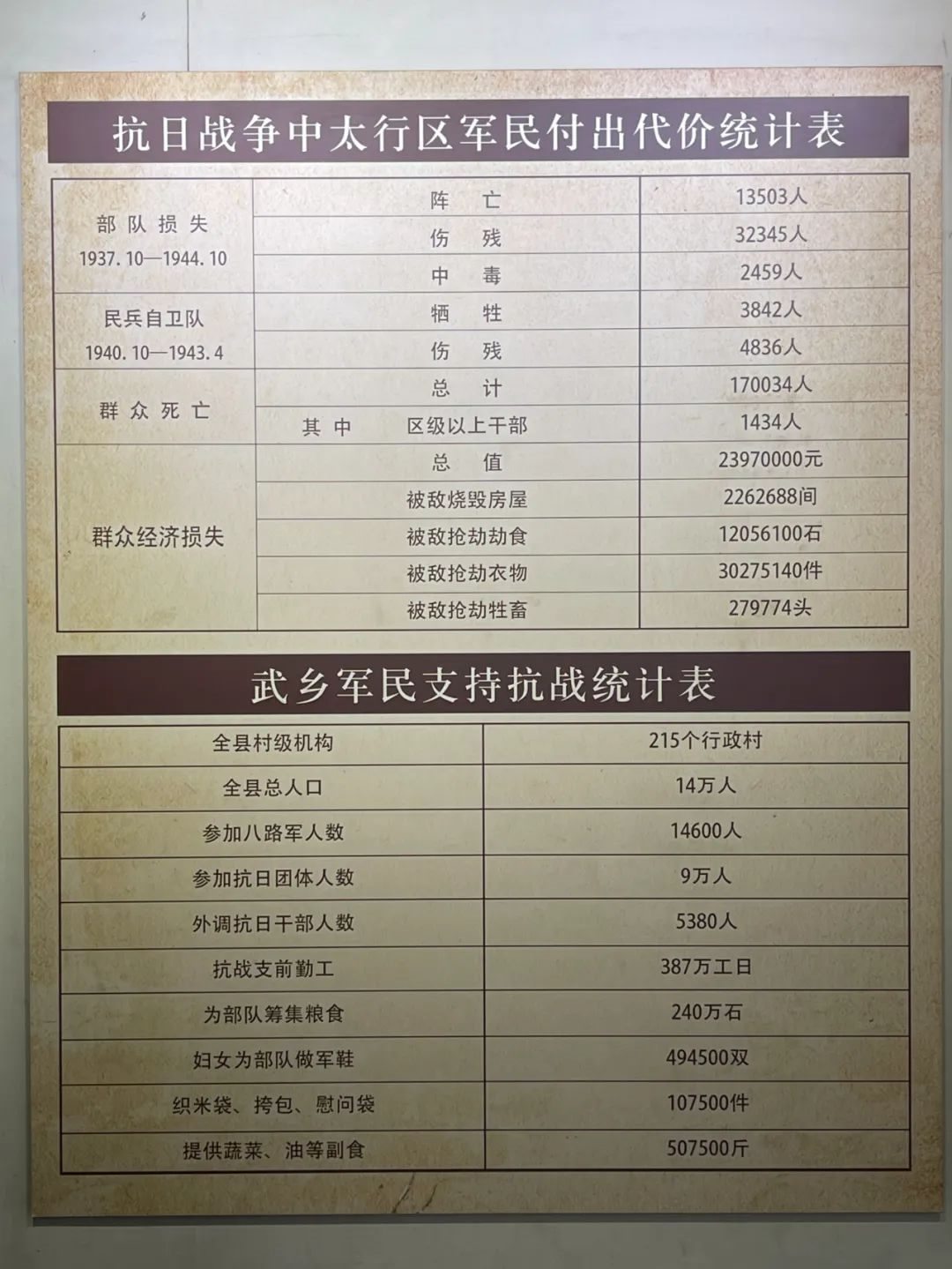 武鄉(xiāng)軍民支持抗戰(zhàn)相關(guān)統(tǒng)計。(新華網(wǎng)于楊攝)