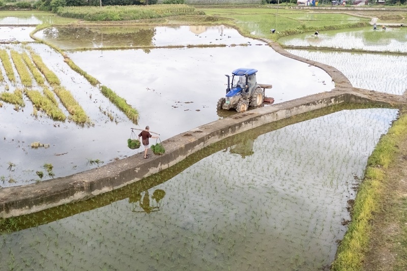 7月21日,農(nóng)民在湖南省婁底市婁星區(qū)杉山鎮(zhèn)杉山村的田間挑運晚稻秧苗(無人機照片)。