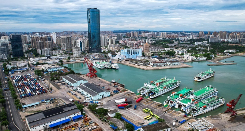 7月22日,裝載完成后的客滾船駛離海口市秀英港(無人機照片)。