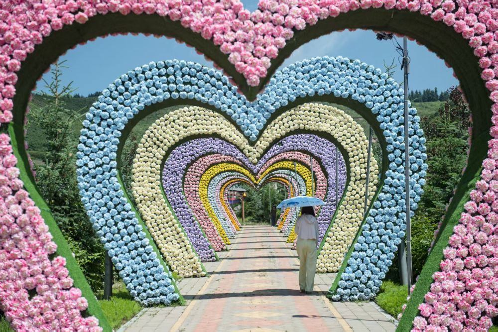 7月22日,在青海省大通縣邊麻溝花海景區(qū),一名游客經(jīng)過鮮花長廊。新華社記者 孫瑞博 攝