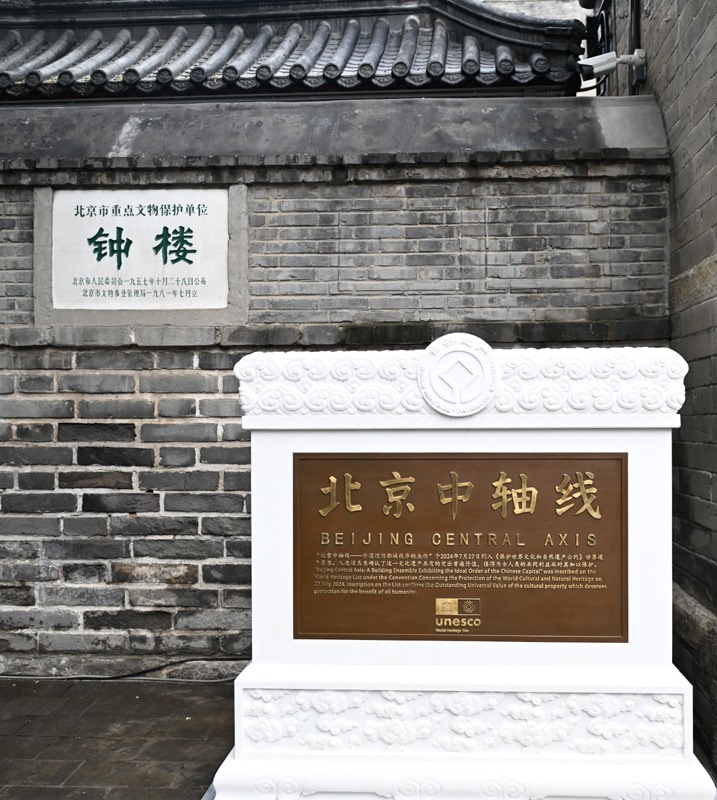 這是7月27日在北京鐘樓前拍攝的北京中軸線(xiàn)世界文化遺產(chǎn)標(biāo)志碑。