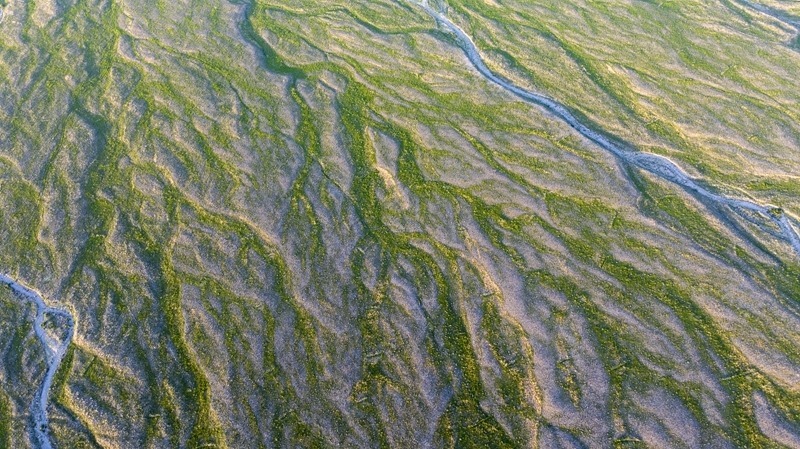 賀蘭山下的戈壁灘草木茂盛(7月29日攝,無人機(jī)照片)。