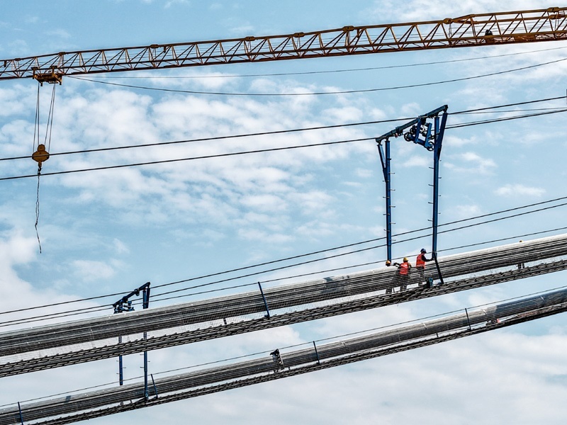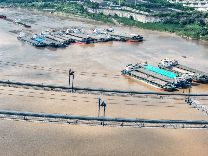7月30日,在重慶黃桷沱長江大橋建設現(xiàn)場,工人在施工作業(yè)(無人機照片)。