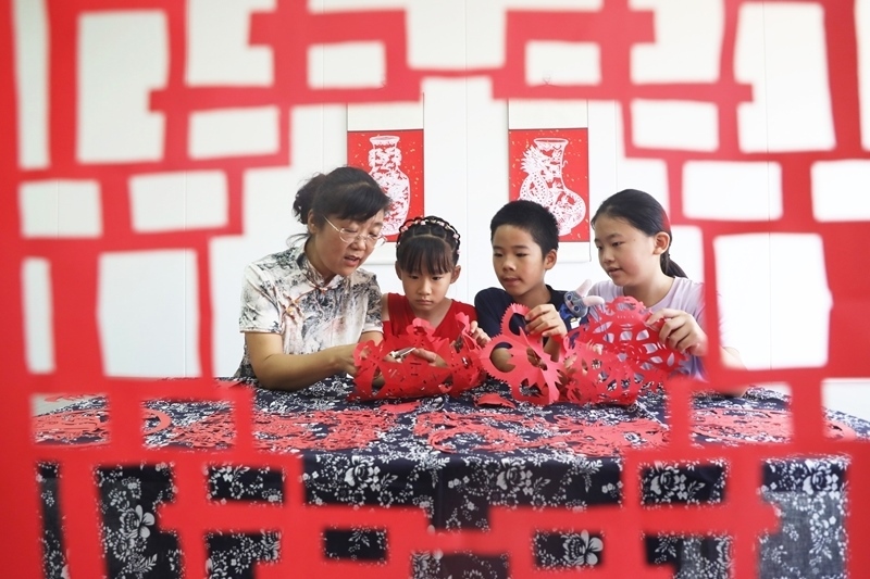 8月9日,河北省唐山市豐潤區(qū)燕山路街道欣園社區(qū),小朋友在學習剪紙。