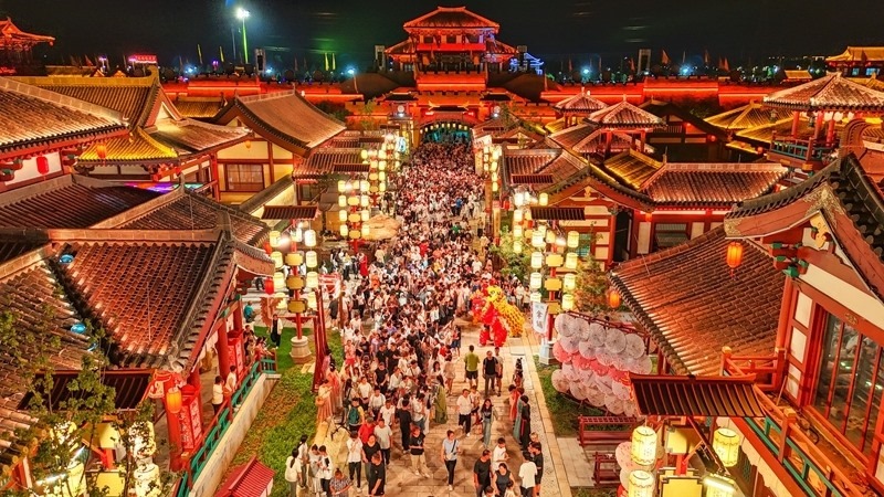 8月9日,山東樂陵影視城景區(qū)流光溢彩、游人如織(無人機照片)。