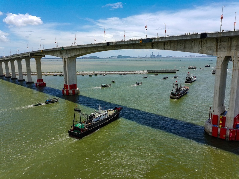 8月16日,出港的漁船駛過博賀灣大橋(無人機照片)。