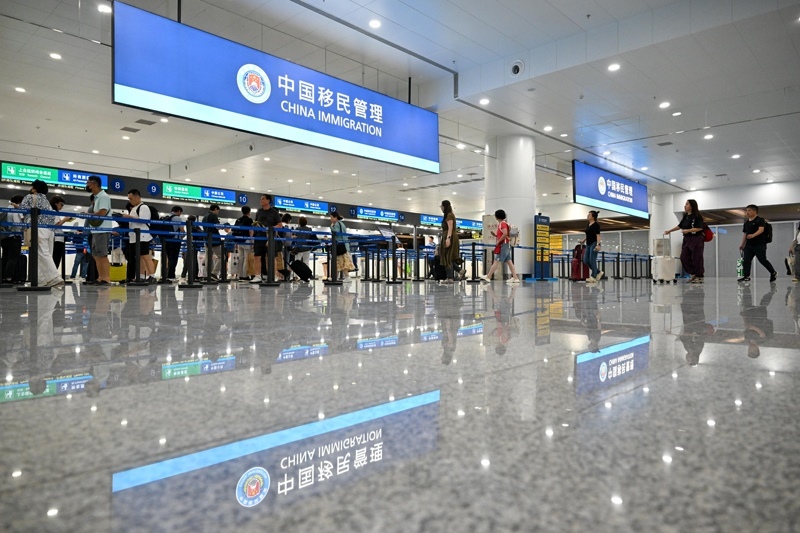 8月27日,在天津?yàn)I海國際機(jī)場(chǎng)T1航站樓,旅客排隊(duì)入境查驗(yàn)。