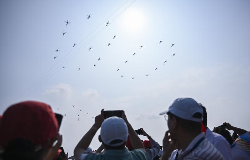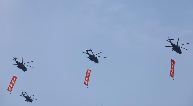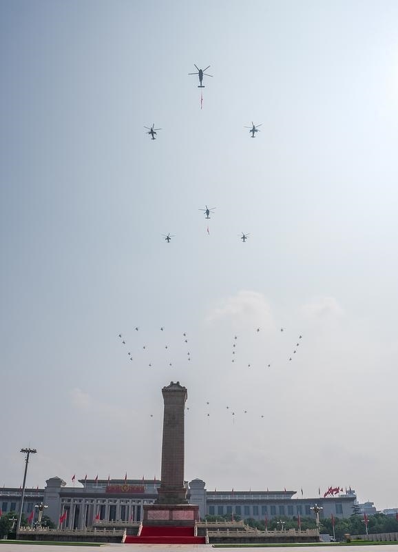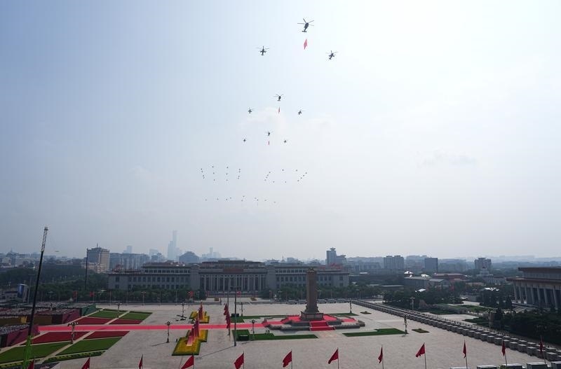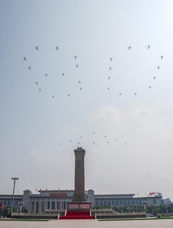 9月3日,紀(jì)念中國(guó)人民抗日戰(zhàn)爭(zhēng)暨世界反法西斯戰(zhàn)爭(zhēng)勝利80周年大會(huì)在北京隆重舉行。這是空中護(hù)旗梯隊(duì)飛過(guò)天安門廣場(chǎng)上空,26架直升機(jī)匯成巨大的“80”字樣。