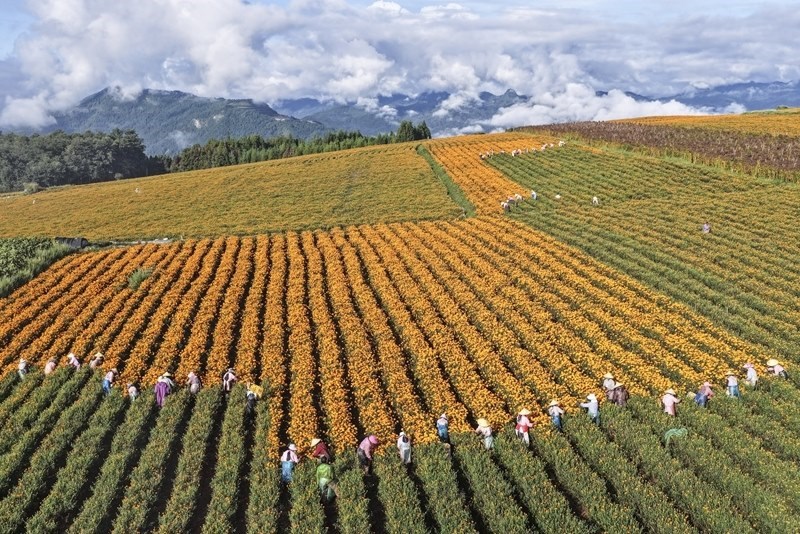 9月5日,農民在云南騰沖市明光鎮(zhèn)鳳凰村鳳凰山采收萬壽菊(無人機照片)。