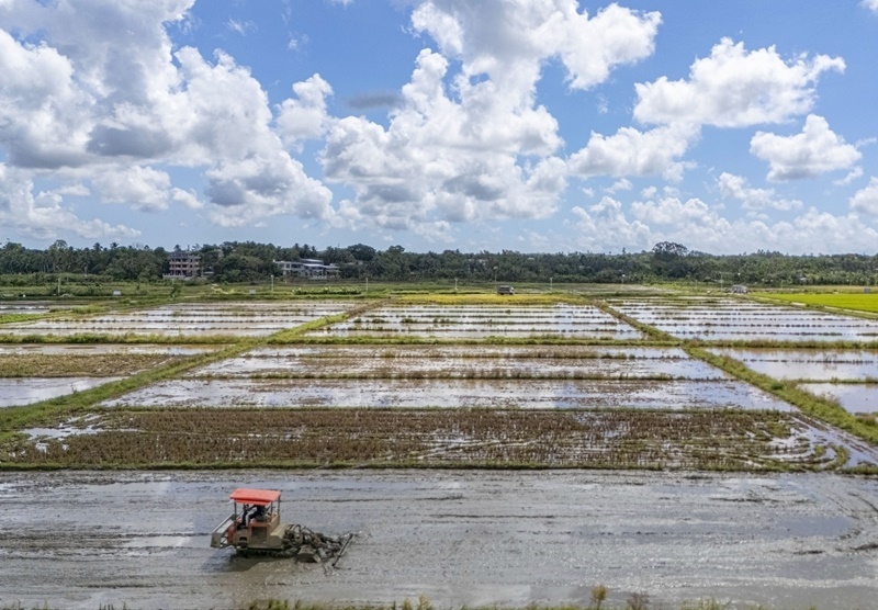9月4日,海南省瓊海市農機手在龍壽洋田野公園耕作(無人機照片)。