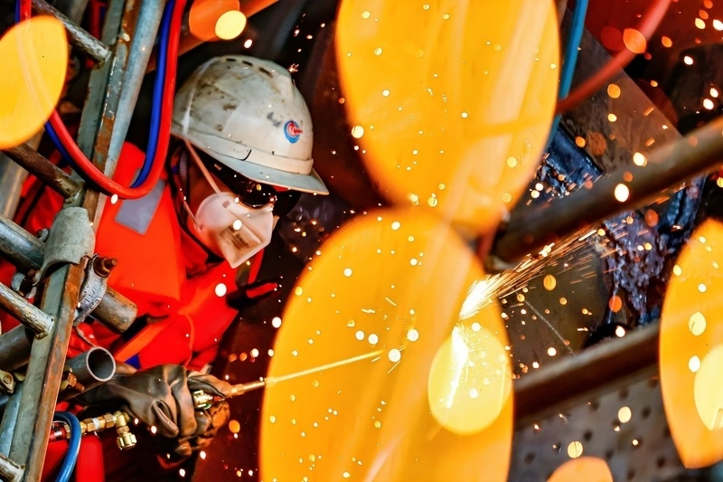9月8日,工人在墾利6-1油田10-1北區(qū)塊Ⅱ期開發(fā)項目油氣平臺安裝作業(yè)現(xiàn)場進行切割作業(yè)。