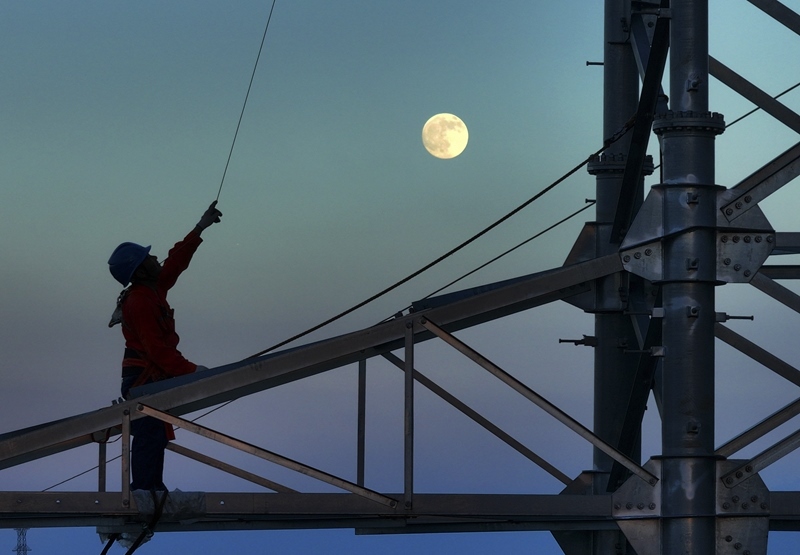 10月6日,在湖南省衡陽(yáng)市雁峰區(qū),高塔架線工人在月光的映射下施工(無(wú)人機(jī)照片)。