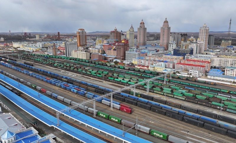 10月18日,在中國鐵路哈爾濱局集團(tuán)有限公司綏芬河站南場,滿載進(jìn)口貨物的列車等待解體換裝(無人機(jī)照片)。