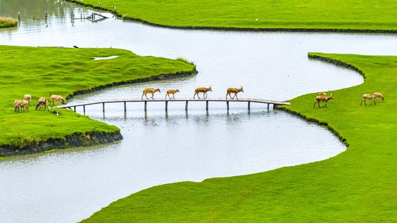 10月17日,在江蘇省泰州市姜堰區(qū)溱湖國(guó)家濕地公園,一群麋鹿通過(guò)獨(dú)木橋(無(wú)人機(jī)照片)。