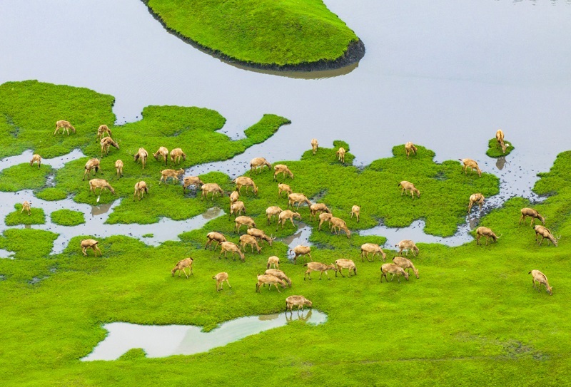 10月17日,在江蘇省泰州市姜堰區(qū)溱湖國(guó)家濕地公園,一群麋鹿在棲息、覓食(無(wú)人機(jī)照片)。