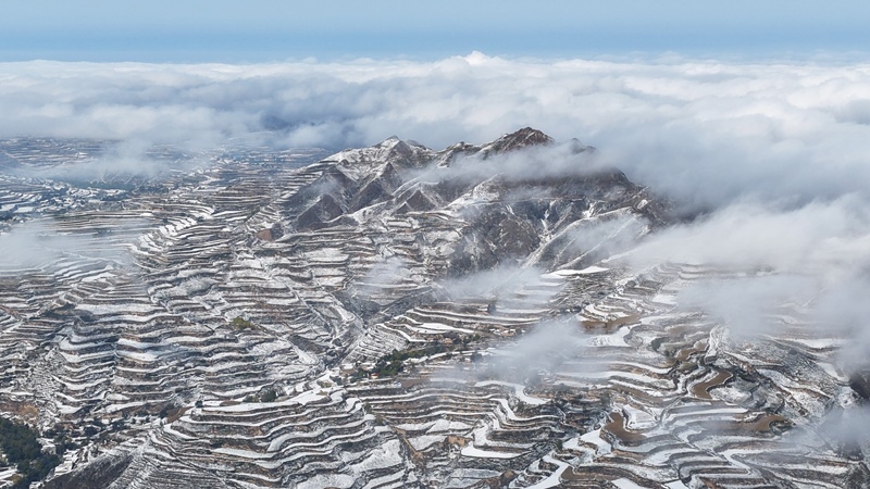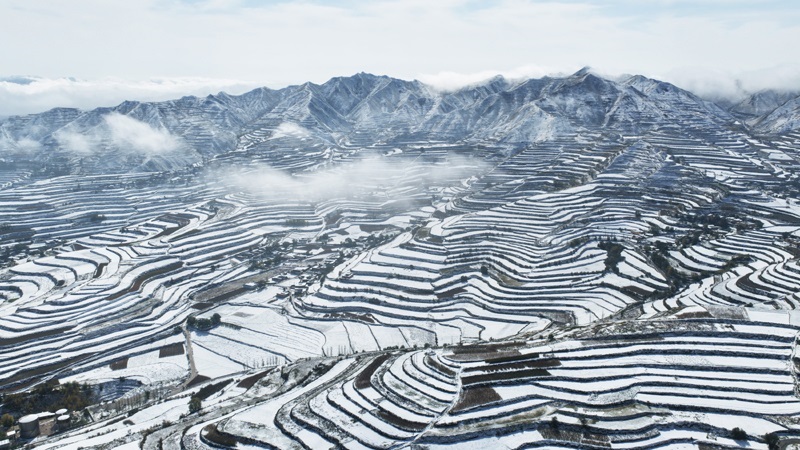 這是10月17日在甘肅永靖縣陳井鎮(zhèn)拍攝的雪后梯田(無(wú)人機(jī)照片)。