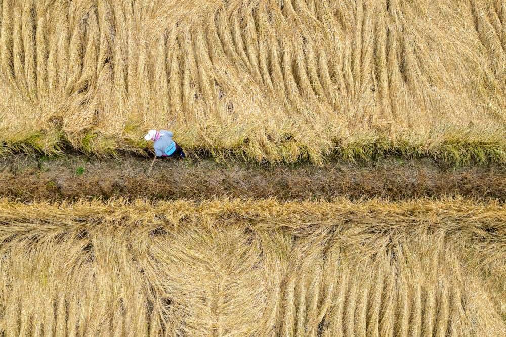 10月14日,在黑龍江省牡丹江市西安區(qū)沙虎村,村民在水稻田里忙碌(無人機照片)。新華社記者 張濤 攝