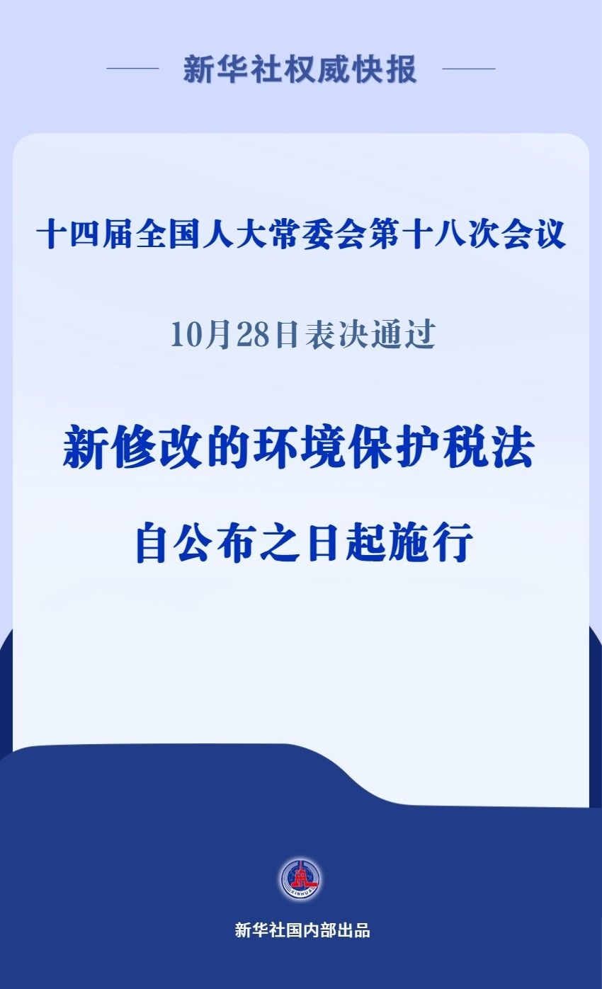 十四屆全國人大常委會第十八次會議10月28日表決通過關(guān)于修改環(huán)境保護(hù)稅法的決定,并自公布之日起施行。