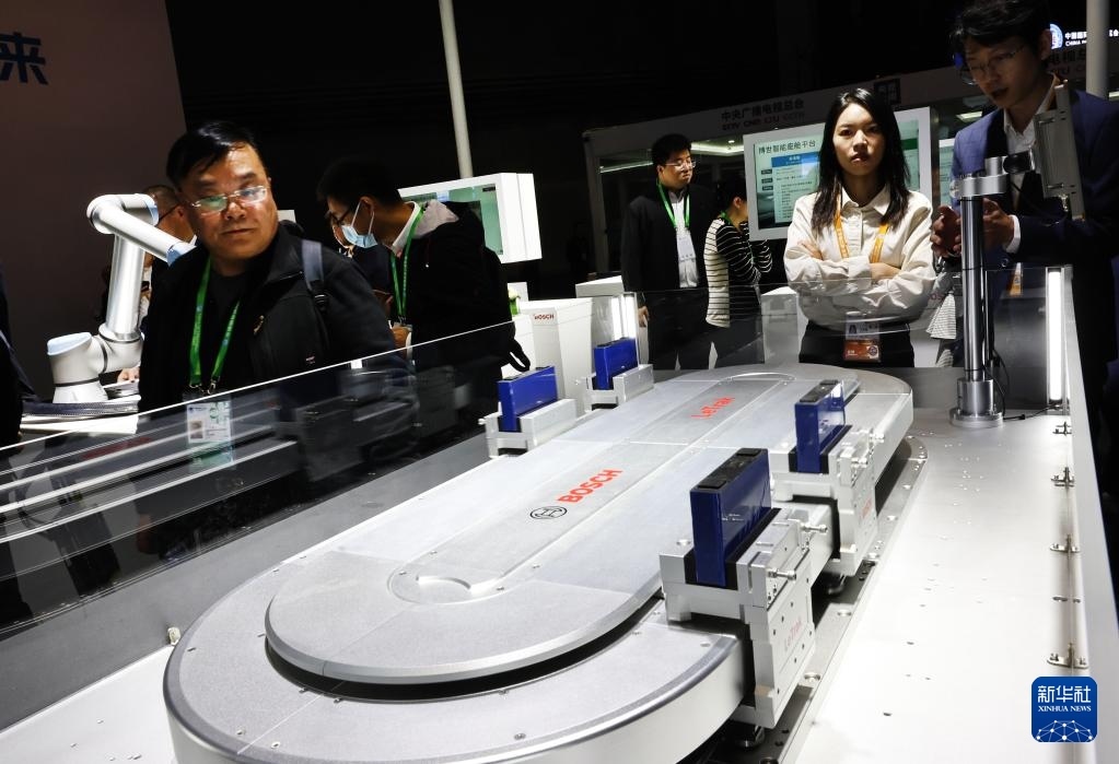 11月6日,參觀者在博世公司展臺展出的LeTrak磁驅(qū)傳輸系統(tǒng)展品旁駐足觀看,這是該產(chǎn)品的全球首發(fā)。
