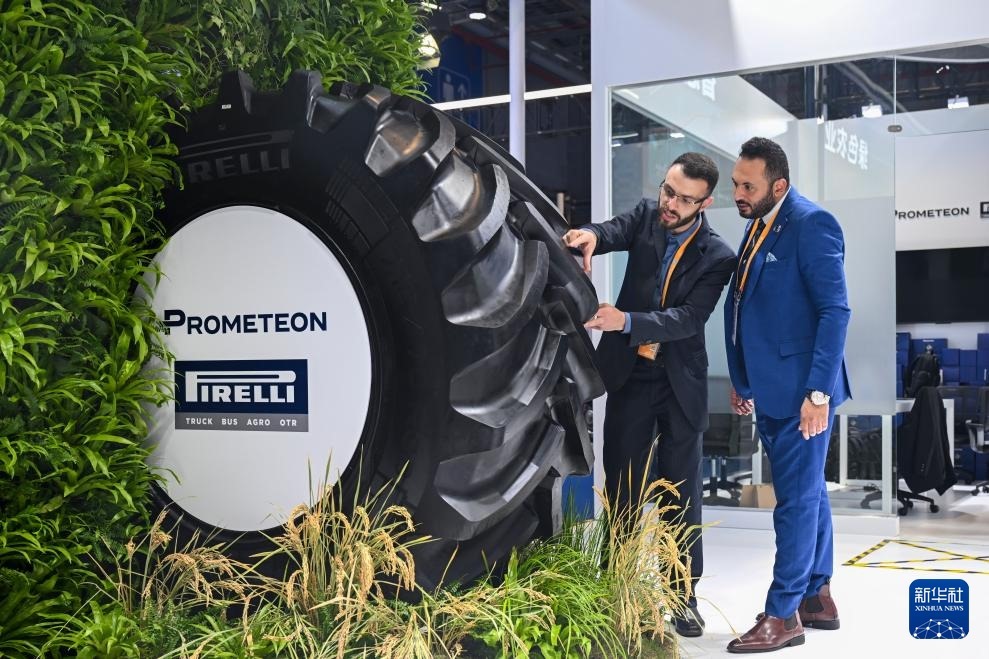 11月6日,在進(jìn)博會汽車及智慧出行展區(qū)百得安輪胎集團(tuán)展臺,展商在亞洲首發(fā)產(chǎn)品綠色農(nóng)業(yè)輪胎AT02前交流。