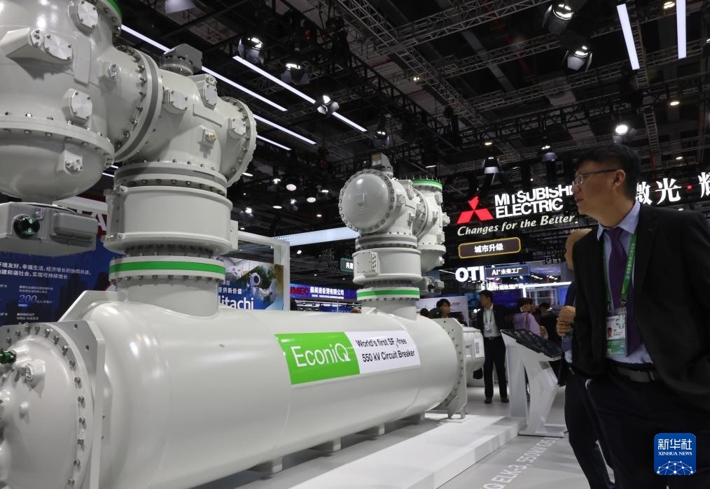 11月6日,參觀者在日立公司一款封閉式氣體絕緣開關(guān)設(shè)備展品旁駐足觀看,這是該型號產(chǎn)品的中國首展。