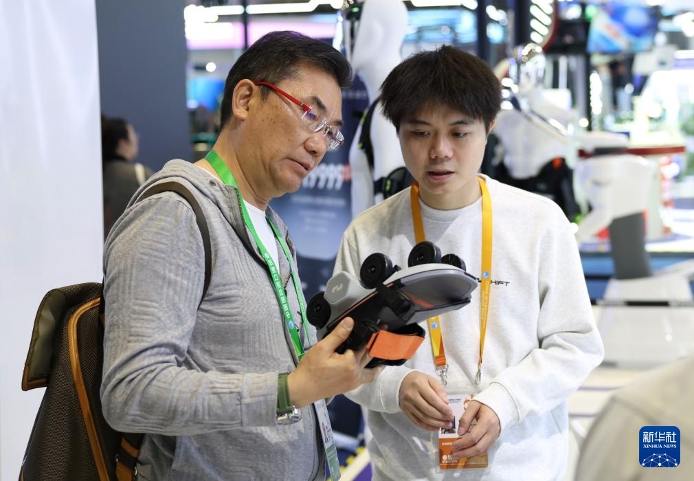 11月6日,在進(jìn)博會創(chuàng)新孵化專區(qū)瞬動科技展臺,一名展商(右)向參觀者介紹其全球首發(fā)的踏月者Air輪式外骨骼。