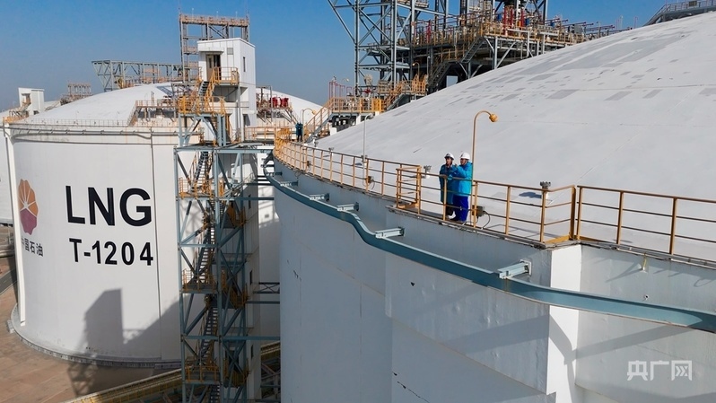 記者和采訪對象站在20萬立方米的LNG儲(chǔ)罐上(央廣網(wǎng)記者 楊夢奎 攝)