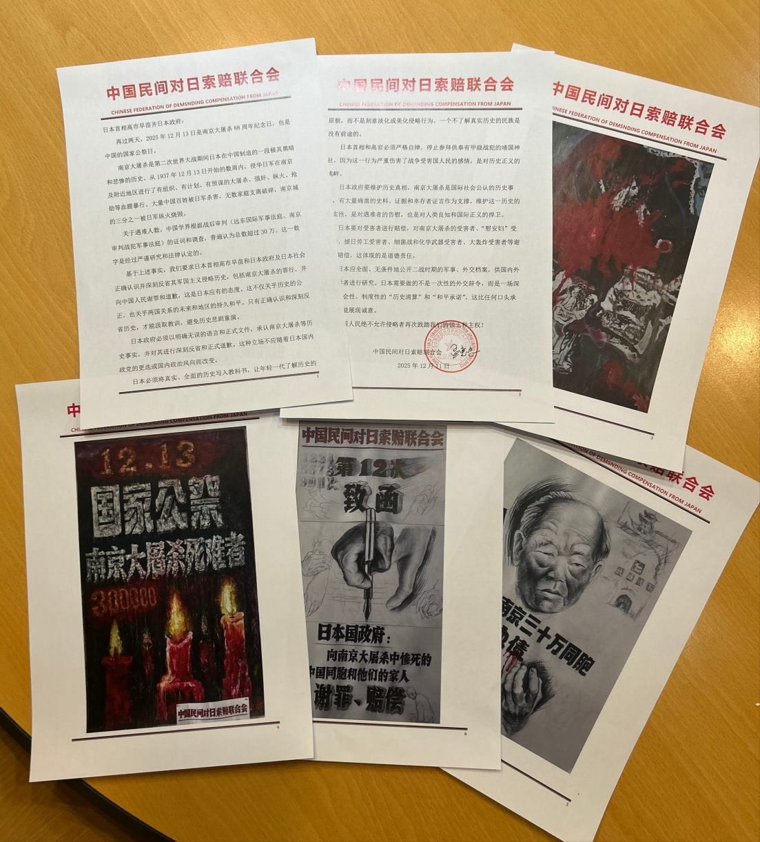 中國(guó)民間對(duì)日索賠聯(lián)合會(huì)成立于1992年,2006年在香港注冊(cè),旨在促使日本政府向侵華戰(zhàn)爭(zhēng)中國(guó)受害者進(jìn)行謝罪、賠償。該組織自2014年開始,每逢南京大屠殺死難者國(guó)家公祭日,必通過日本駐華大使館致信日本政府及其首相,要求日本政府就南京大屠殺謝罪、賠償,此次為第12次致信。(完)