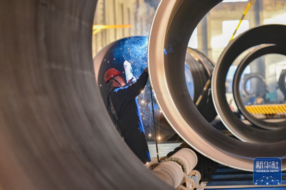 ↑ 12月15日,在山東省青州市益都街道一家大型風電設(shè)備制造企業(yè),工人在車間內(nèi)進行焊接作業(yè)。新華社發(fā)(王繼林攝)