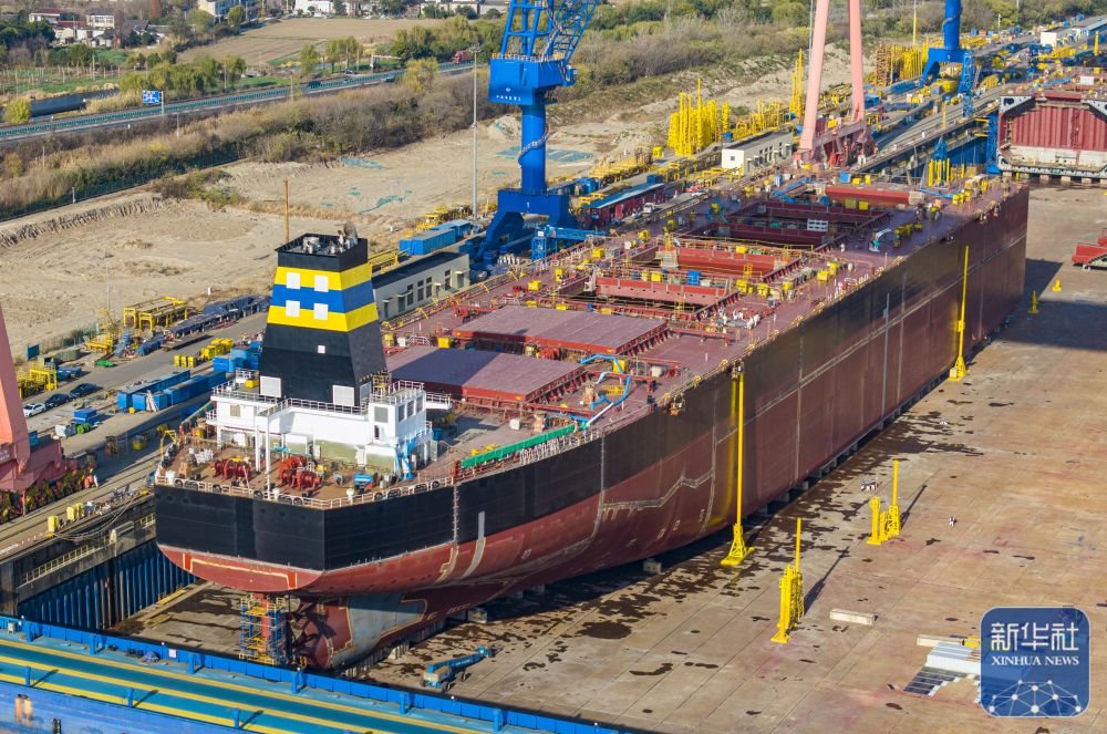 ↑ 12月15日,在江蘇南京招商工業(yè)南京金陵船廠生產(chǎn)廠區(qū),大型船舶在建造中(無人機照片)。新華社發(fā)(辛一攝)