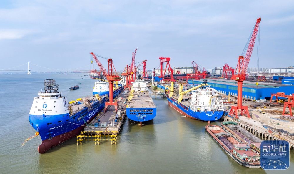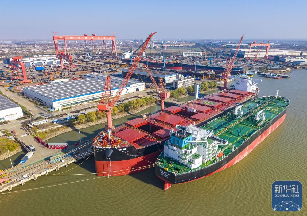 ↑ 這是12月14日拍攝的位于江蘇省江都經(jīng)濟開發(fā)區(qū)的揚州中遠海運重工有限公司生產(chǎn)廠區(qū)(無人機照片)。新華社發(fā)(任飛攝)