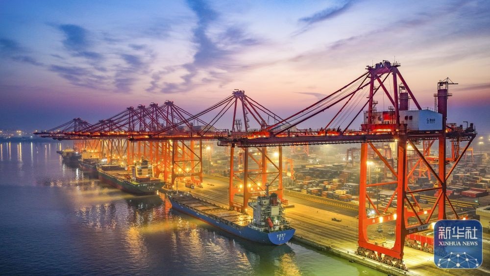 ↑ 12月15日,在山東港口青島港,貨輪在裝卸外貿(mào)集裝箱(無人機照片)。新華社發(fā)(俞方平攝)