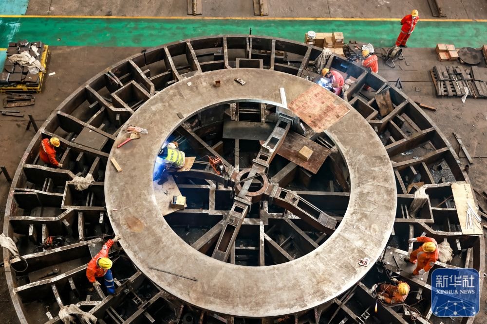 ↑ 12月15日,中鐵科工集團武漢江夏制造基地技術(shù)工人對盾構(gòu)機配件進行裝配作業(yè)。新華社發(fā)(趙軍攝)
