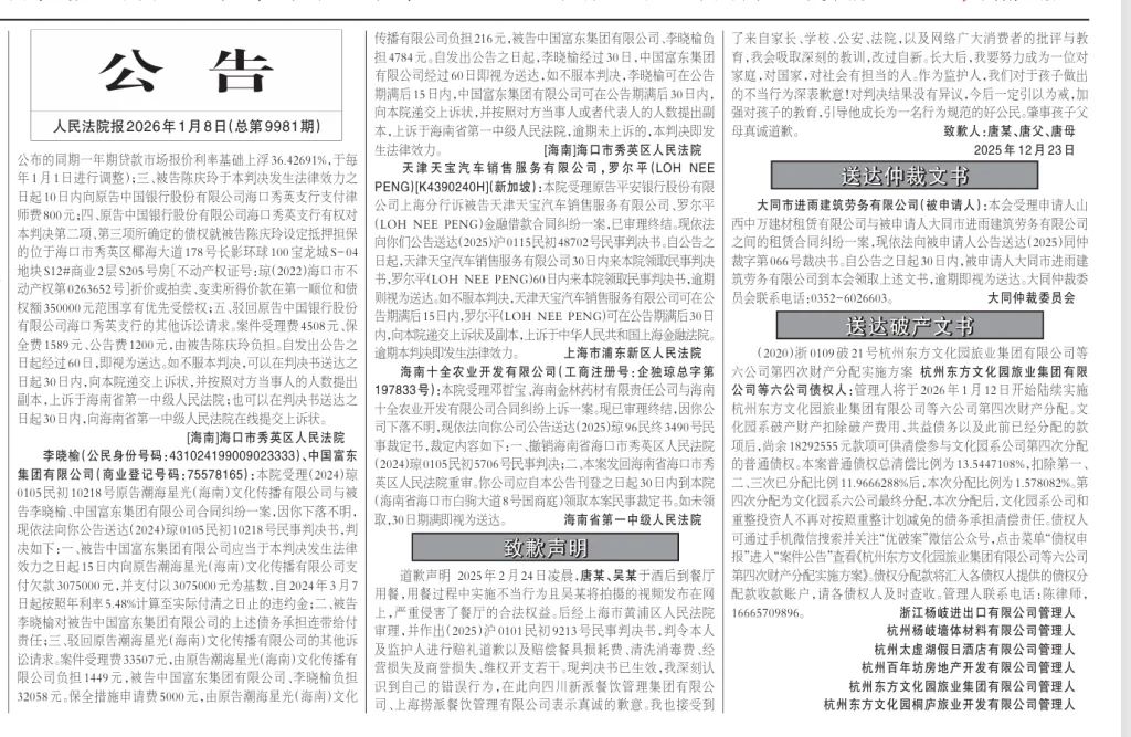 2026年1月8日,《人民法院報(bào)》3版刊登了“海底撈小便”當(dāng)事人唐某及其父母的道歉聲明。