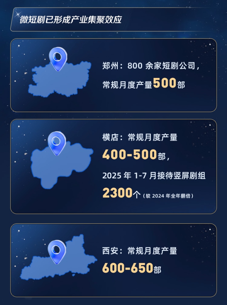 數(shù)據(jù)顯示,全國短劇月度產(chǎn)量已穩(wěn)定在約3000部,并在區(qū)域分工趨勢下,帶動就業(yè)從一線城市向中西部擴(kuò)散。鄭州、西安、橫店等地,正成為這一產(chǎn)業(yè)地理格局的重要支點(diǎn)。