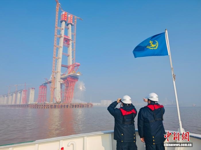 海事部門(mén)工作人員現(xiàn)場(chǎng)保障大橋建設(shè)。嘉興海事局供圖