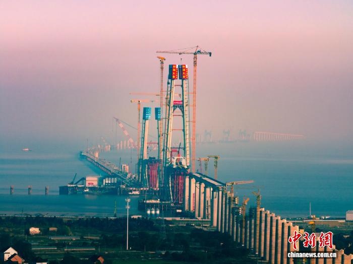 杭州灣跨海鐵路大橋北航道橋8號(hào)主塔封頂。嘉興海事局供圖