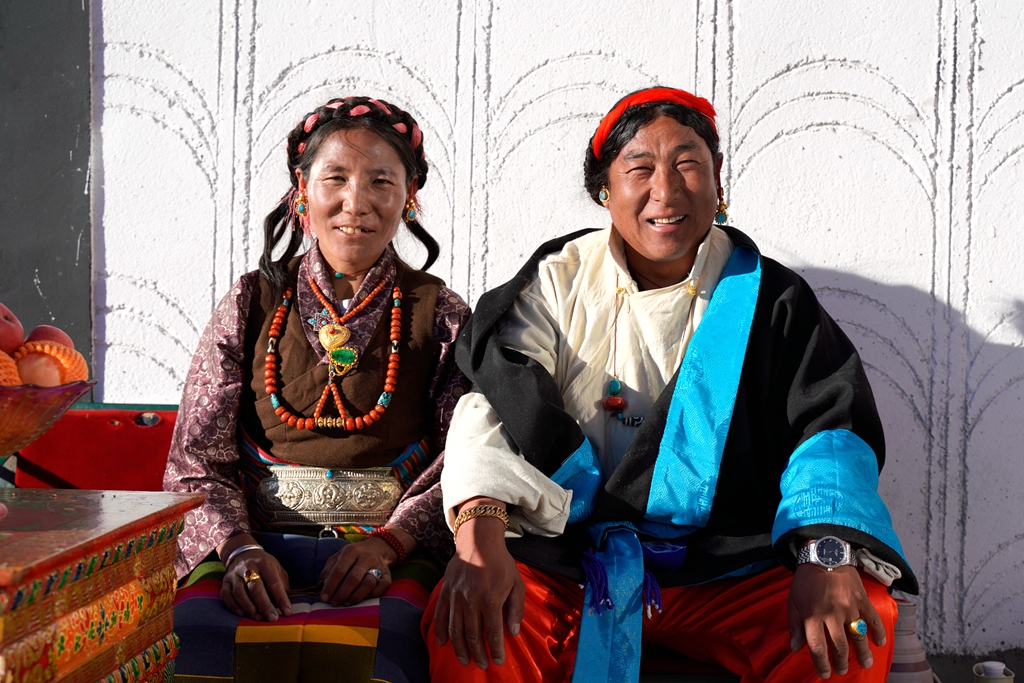 拍攝日,陽(yáng)光清澈,天空湛藍(lán)。村民們穿上了最隆重的藏裝,女人發(fā)間的珊瑚與綠松石流淌著溫潤(rùn)的光澤。許多老人被子女小心攙扶而來(lái),他們的眼神里有局促,有陌生,也有隱約的期待。