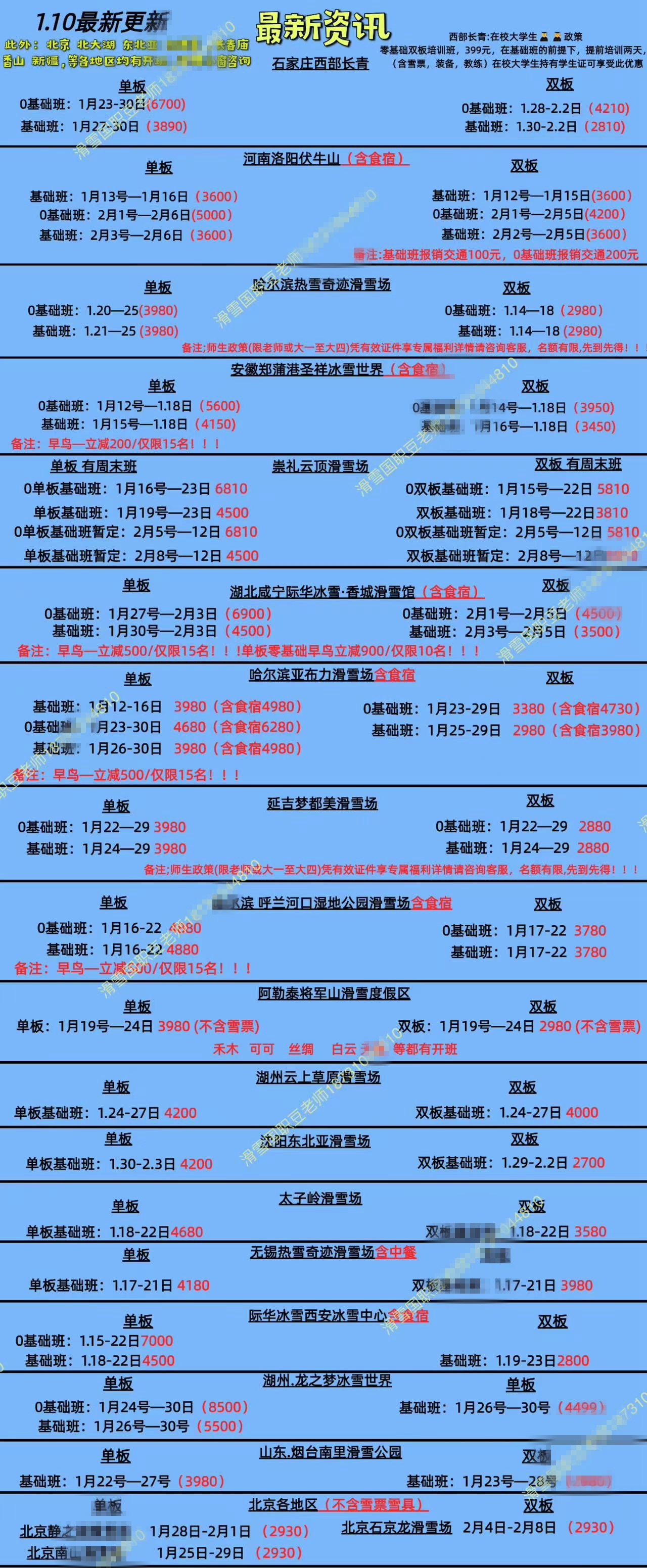 記者以“零基礎”滑雪者想要報考“滑雪國職五級”為由,咨詢了多家滑雪培訓機構。一位培訓基地的豆先生展示了多個能提供培訓的雪場名單,涉及河北石家莊、河南洛陽、湖北咸寧、黑龍江哈爾濱等多地。當記者表示北京及周邊雪場更加方便時,豆先生隨即發(fā)來了包含培訓班日期、地點、價格等一系列報名細則的“國職教練證考試資訊”。