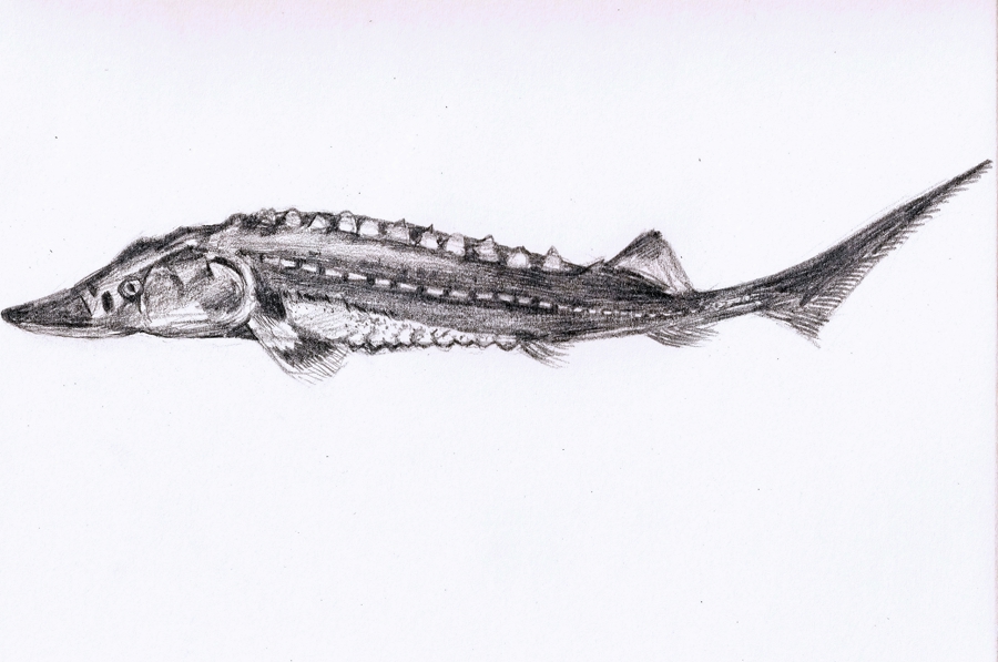 中華鱘生長較快,體型碩大,最大個體體長可達(dá)4米,體重可達(dá)680千克,最長壽命可達(dá)40齡以上 上海海洋大學(xué)學(xué)生手繪