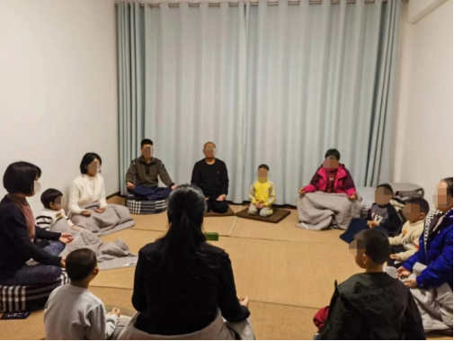 ▲家長帶著孩子參加“乾源文化”打坐練功